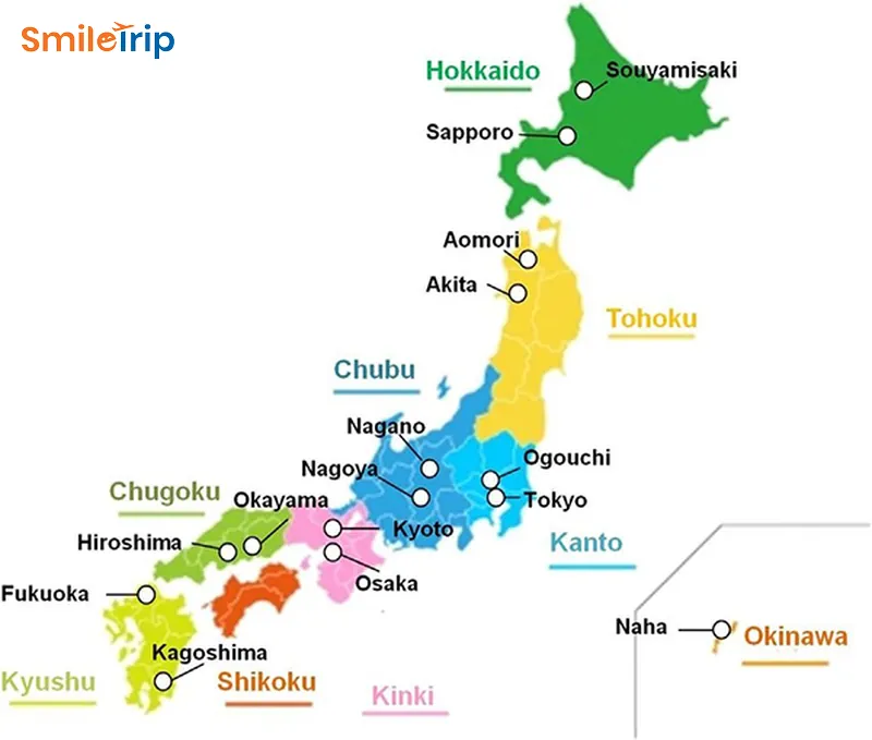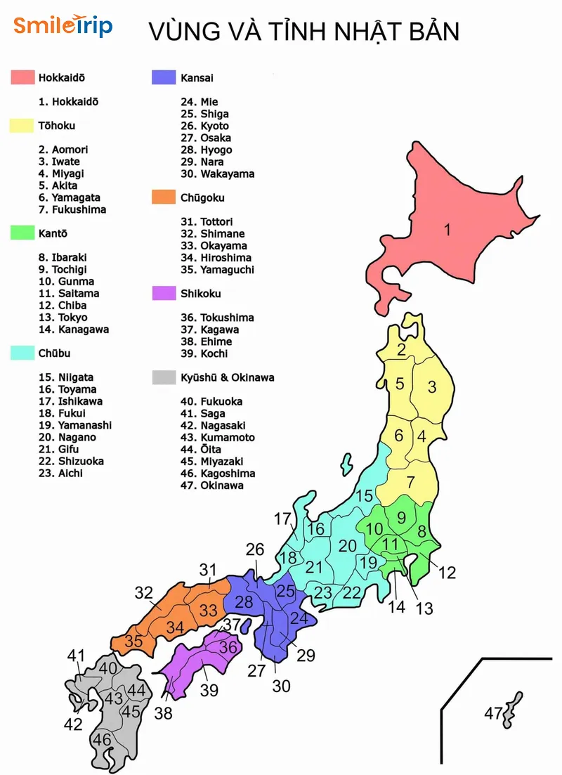 Dưới đây là bảng tổng hợp 47 tỉnh thành của Nhật Bản, được chia theo 8 vùng lớn để du khách dễ theo dõi và lựa chọn điểm đến. Smile Trip đã tổng hợp lại thông tin một cách rõ ràng và dễ hiểu để du khách tiện sử dụng trong quá trình lên kế hoạch.