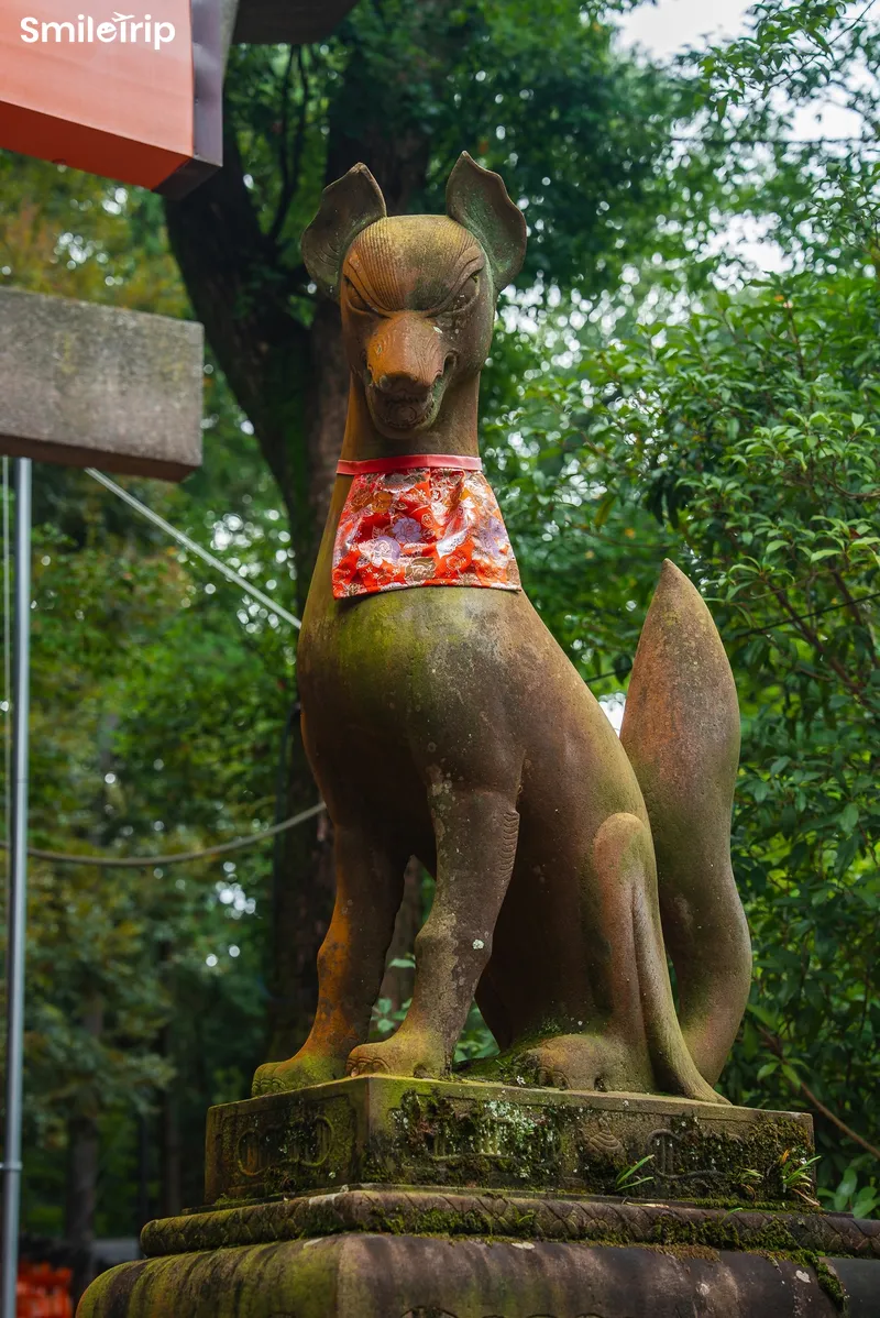 Trong khuôn viên Fushimi Inari-taisha, du khách dễ dàng bắt gặp hàng trăm tượng cáo đá Kitsune - linh vật và cũng là sứ giả của thần Inari. Cáo trong tín ngưỡng Thần đạo Nhật Bản tượng trưng cho trí tuệ, sự nhanh nhạy và khả năng kết nối giữa con người với thế giới tâm linh.