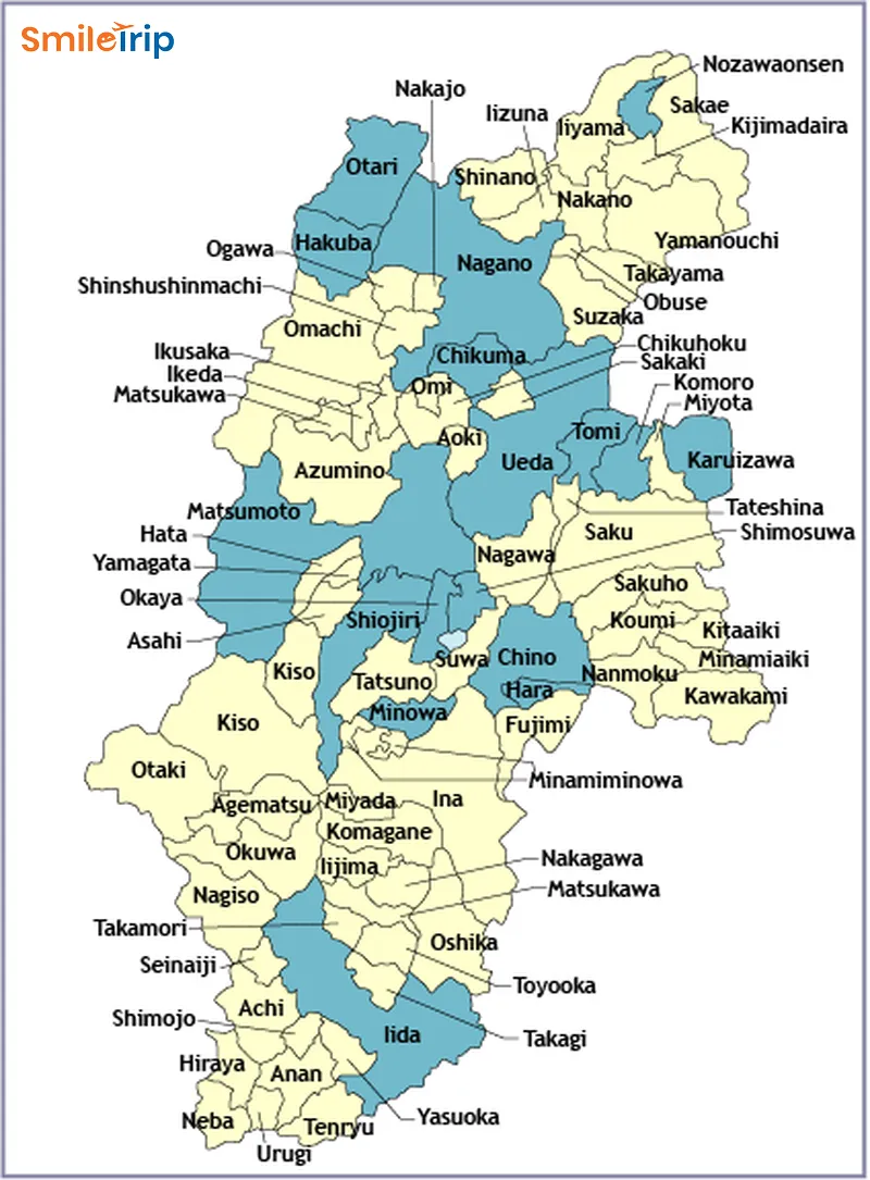 Nagano là tỉnh có diện tích lớn thứ tư Nhật Bản, nổi bật với địa hình núi cao và các thị trấn – thành phố nằm xen giữa thung lũng và cao nguyên. Nhờ bản đồ hành chính rõ ràng, du khách có thể dễ dàng hình dung cấu trúc toàn tỉnh và lựa chọn khu vực phù hợp cho hành trình khám phá.