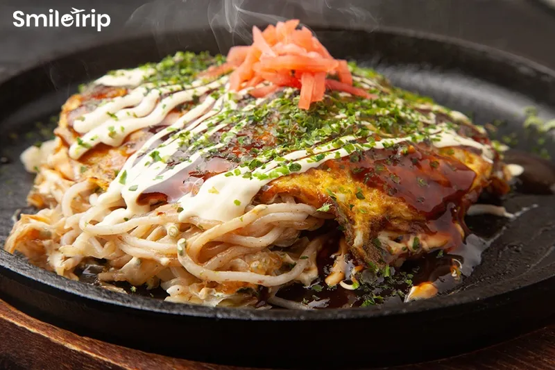 Hiroshima Okonomiyaki – món bánh xèo kiểu Nhật nổi tiếng của Hiroshima, được chế biến từ bột, bắp cải, thịt, hải sản và mì yakisoba xếp thành nhiều lớp. Đây được xem là một trong những món ăn đặc trưng mà du khách thường muốn thử khi ghé thăm thành phố.