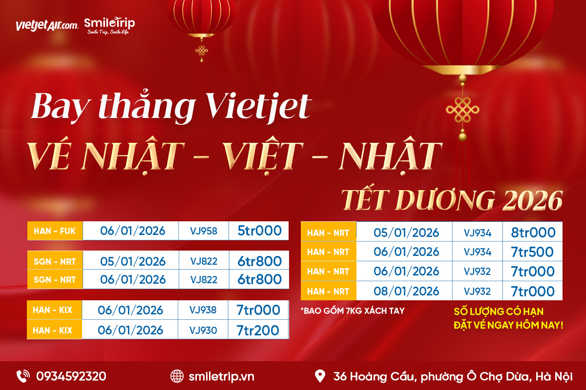 Tết Dương lịch là cao điểm “ngắn nhưng nóng” tuyến Nhật – Việt – Nhật: giá vé lẻ biến động mạnh, giờ bay đẹp nhanh hết, chần chừ 1–2 ngày là giá có thể tăng; để chốt giá hời mà lịch bay vẫn hợp lý, hãy chọn đúng nguồn vé, chốt đúng thời điểm và nắm rõ điều kiện trước khi giữ chỗ—bài viết sẽ hướng dẫn và gợi ý lựa chọn nhiều khách ưu tiên mùa cao điểm: vé BLOCK tại SmileTrip.