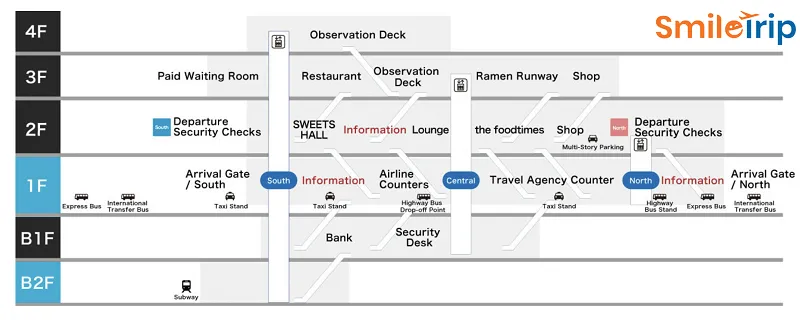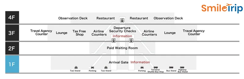 - Tầng 1: Sảnh đến, điểm đón taxi, xe bus và tuyến tàu điện ngầm Fukuoka City Subway.